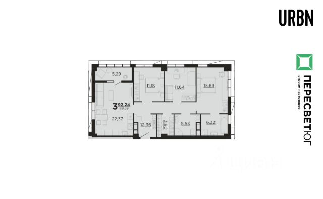 Раздельные комнаты: 16.1 + 21.9 + 12.9 метров