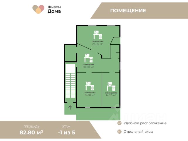 Ваш идеальный бизнес-объект в центре жилого района! Предлагаем уникальную возможность приобрести встроенное помещение на цокольном этаже многоэтажного жилого дома площадью 73,3 кв.м. с отдельным входом с улицы. Это идеальное решение для малого и среднего бизнеса в сфере услуг. Почему именно это помещение? • Отдельный вход с улицы: Ваши клиенты смогут удобно и без лишних хлопот попасть к вам. Забудьте о проблемах с доступом через общий подъезд - здесь все продумано для вашего комфорта и конфиденциальности! • Гибкая планировка: Четыре комнаты позволяют легко организовать пространство под ваши нужды. • Создайте уютные кабинеты для врачей, массажистов или косметологов, или используйте одну из комнат как зону ожидания для клиентов. • Санузел: Наличие собственного санузла - это дополнительное удобство как для вас, так и для ваших клиентов. Это особенно важно для медицинских и косметологических услуг. • Высокая проходимость: Помещение расположено в густонаселенном жилом районе, что обеспечивает стабильный поток клиентов. Ваш бизнес будет на виду, а это значит, что вы сможете быстро привлечь новых клиентов. • Подходит для различных видов деятельности: Это помещение идеально подходит для медицинских и косметологических услуг, парикмахерских, салонов красоты, а также офисов для риэлторов, юристов, турагентств и других специалистов. Возможности для инвесторов: Если вы ищете выгодное вложение, это помещение станет отличным активом для сдачи в аренду. Стабильный доход и высокий спрос на услуги в этом районе гарантированы! Не упустите свой шанс! Свяжитесь с нами уже сегодня, чтобы узнать больше и организовать просмотр. Ваш новый бизнес начинается здесь!