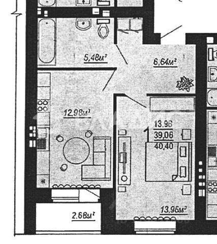 Общая площадь 40,4 / кухня 12,98 / комната 13,96 кв. м.
