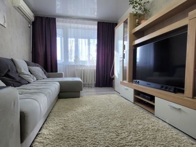 Квартира в отличном состоянии. Выполнен качественный евро ремонт, полностью заменили эл.проводку, водопроводные трубы и отопительную систему, установлены биметаллические радиаторы отопления. Окна пластиковые, потолок в гостиной натяжной, в спальнях и коридоре - из гипсокартона, полы (бетонная стяжка) - ламинат и плитка. Установлены современные межкомнатные и надежная входная двери. Санузел облицован современной кафельной плиткой, установлена новая и качественная сантехника. В ванной комнате, установлена большая чаша с "джакузи", в туалете - инсталляция. Есть застекленная пластиком лоджия, утеплена.