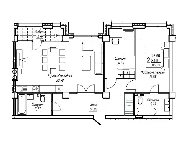 Площадь квартиры - 52,2 кв.м.;