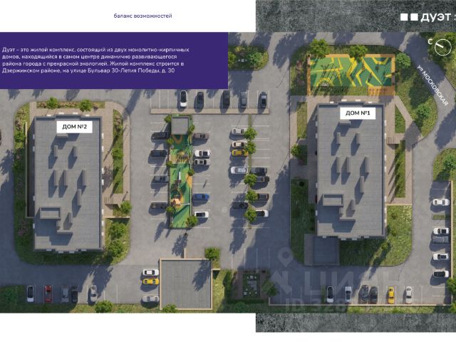 Дуэт — двойное удовольствие от жизни. Ключи скоро. Новый жилой комплекс в Дзержинском районе. Два 18-этажных дома на благоустроенной территории создают особый ансамбль — "ДУЭТ", в котором хочется жить активной жизнью. В архитектурном облике "ДУЭТА" воплотились современные градостроительные тенденции. Сочетание благородных природных оттенков в фасадном решении, витражное остекление, корзины под сплит-системы создают стильный и элегантный внешний вид комплекса. Внутридомовая территория ЖК "ДУЭТ" — это место, в котором вы будете отдыхать, заниматься спортом, встречаться с друзьями и играть с детьми. Для ценителей здорового образа жизни на территории ЖК предусмотрена спортивная площадка. Также в проекте благоустройства территории запланировано оригинальное озеленение с элементами ландшафтного дизайна, беседки. Функциональные планировочные решения позволят будущим жителям эргономично организовать окружающее пространство. Благодаря высоким потолкам 2.7 м и грамотно распланированной площади даже в самой компактной квартире будет много света и воздуха. ____________________ В Апреле действует акционное предложение на 6 квартир. Узнай подробности в отделе продаж. *Не оферта. Данное предложение действительно на дату размещения и в течении 2-х дней. Актуальную стоимость уточняйте в отделе продаж в день обращения.