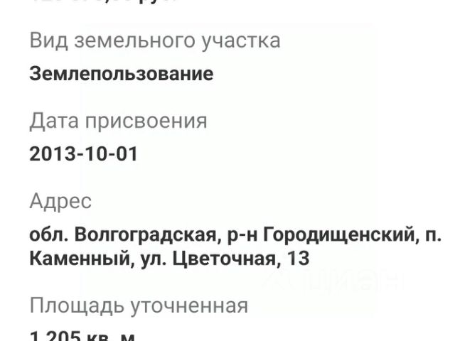 Кадастровый номер: 34:03:120006:2486 Категория земель: Земли населенных пунктов Виды разрешенного использования: для индивидуального жилищного строительства Местоположение: обл. Волгоградская, р-н Городищенский, р.п. Городище, ул. им. И. Айвазовского, 20 Участок прямоугольный. Площадь, м2: 1000 +/- 22. Ровный. Подъезд к участку с одной стороны. Собственник, возможен разумный торг.