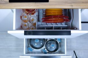 На кухне: холодильник, варочная панель, чайник, СВЧ. Набор посуды и столовых принадлежностей.