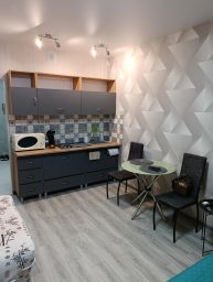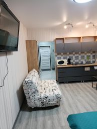 Студия с качественным ремонтом, на 6 этаже 17-ти этажного дома. Дом расположен в жилом комплексе "Атмосфера". В доме есть грузовой и пассажирский лифт, консьерж, система видеонаблюдения по этажно . С одной и с другой стороны дома- детские площадки , по периметру дома газон. В шаговой доступности аквапарк ,продуктовые магазины, кафе, мойка машин , парковочные места для автотранспорта и другое. Территория огорожена по всему периметру забором. Вьезд в жилой комплекс через шлагбаум. О квартире: студия 27м кв. мебелирована всем необходимым для комфортного проживания. В ванной комнате (туалет) установлены новая ванна, стиральная машинка, умывальник. В коридоре стоит шкаф. В комнате зона кухни и зона отдыха. Кухонный гарнитур новый , электроплита, чайник, посуда, микроволновая печь, и др. В комнате большая двухспальная кровать( новая) , столик стеклянный , стулья, диванчик (раскладной), телевизор , сплит-система , холодильник , шкаф-пенал(новый). Лоджия большая ( 4,4 кв.м.) с прекрасным видом во двор с панорамными окнами. Скоростной интернет.