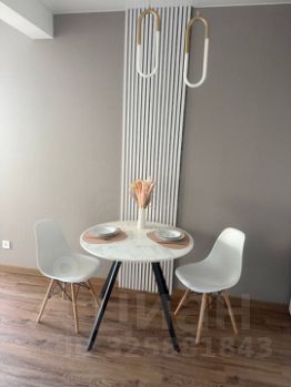 Кухня оснащена полноценным кухонным гарнитуром, обеденным столом и стульями.