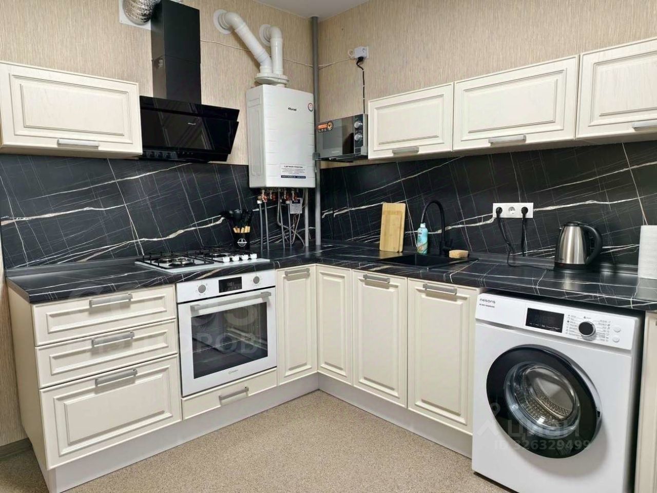 Кухня: Площадью 10 кв.м. с современным кухонным гарнитуром, плитой, духовкой, вытяжкой, холодильником, микроволновой печью и чайником.