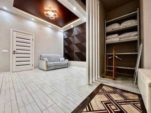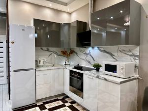 - Всё для вашего удобства: холодильник, стиральная и посудомоечная машина, сплит-система, микроволновка, электрочайник, плита, телевизор, интернет, утюг, фен, отпариватель