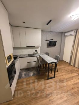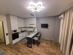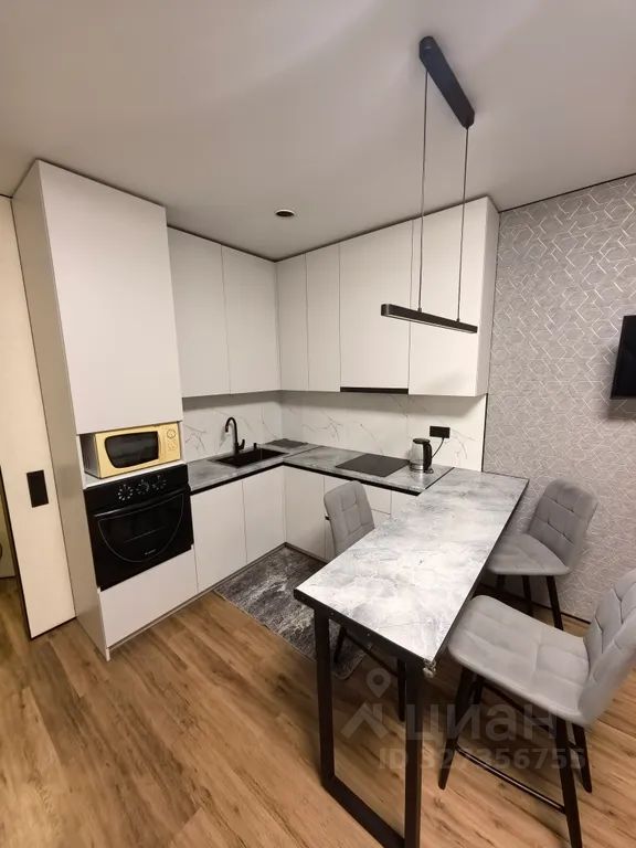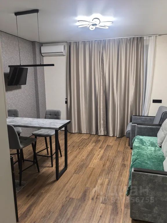 Пространство грамотно зонировано: зона отдыха, мини-кухня и обеденное место гармонично сочетаются, не перегружая помещение.