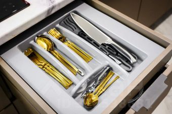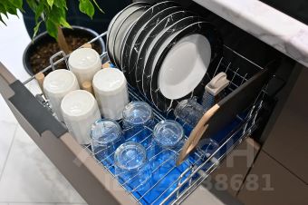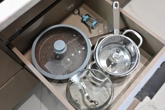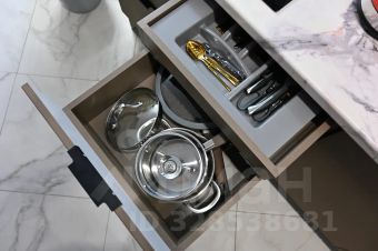 Полный набор посуды: кастрюли, сковородки, ножи, столовые приборы, тарелки, чашки, стаканы, фужеры;