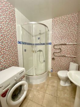 Большая комната в отличном состоянии полностью укомплектована мебелью и техникой. Кухня с электро - плитой, вытяжкой, холодильником, микроволновкой. Установлена сплит-система, новый диван раскладывается, трансформируясь в удобное двуспальное место. Большая застекленная лоджия, сан. узел с душевой кабиной и стиральной машиной.