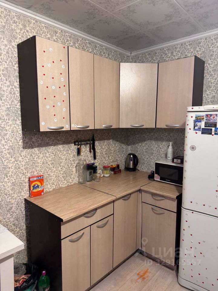 В комнате установлен кухонный уголок: тумбы, навесные шкафы, столешница — можно ставить чайник, микроволновку, резать продукты. Но раковины нет: мыть посуду и руки — в туалете/ванной (внутри блока) либо на общей кухне этажа.