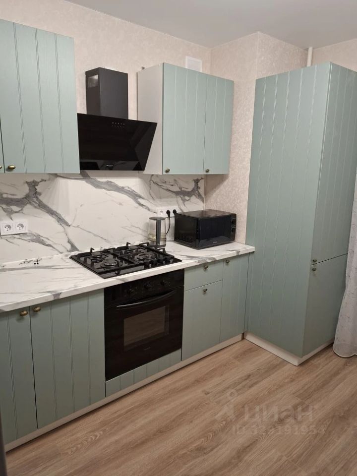 На кухне микроволновая печь, чайник, варочная панель и духовой шкаф.