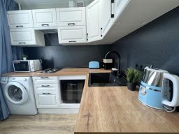 На кухне: газовая-плита, духовка, микроволновая печь, холодильник, электрочайник, посуда для приготовления пищи, столовые приборы, стол, стулья. В ванной комнате: душ, ванна, стиральная машина, фен, полотенца, туалетные принадлежности.