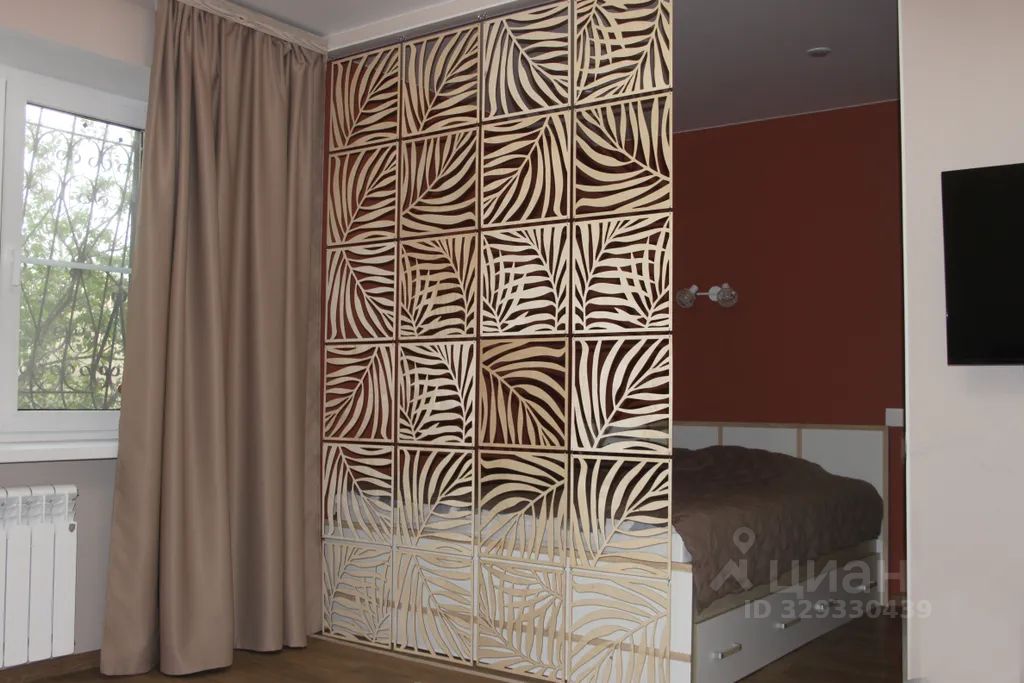 в зоне спальни- двуспальная кровать с ортопедическим матрасом Аскона, в зоне гостинной- раскладной диван.