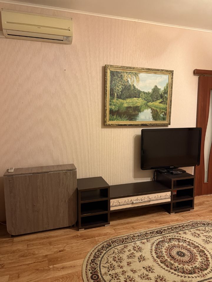 Квартира полностью готова к проживанию. В наличии вся необходимая мебель и техника: диван, телевизор, кондиционер, холодильник, микроволновая печь, газовая плита. Есть кухонный гарнитур, обеденная зона, шкаф для хранения вещей.