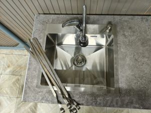 Стол, рабочая зона и раковина.