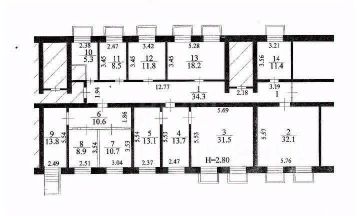 Планировка коридорного типа, кабинеты на обе стороны дома. Перегородки между помещениями не несущие, в связи с этим возможна перепланировка и объединение некоторых кабинетов в единое большое пространство.