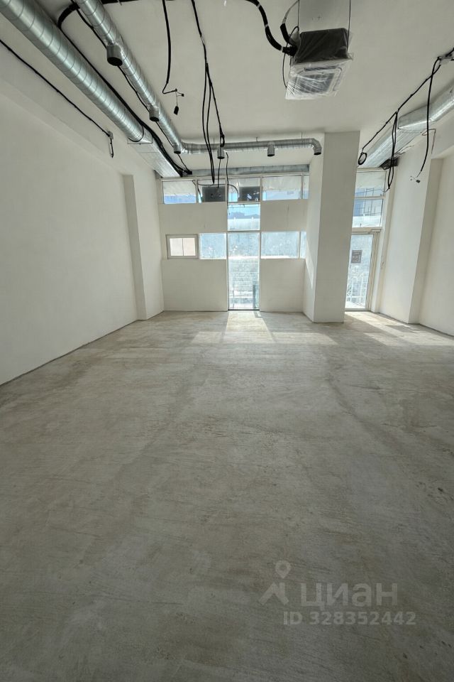 Общая площадь - 78.3м2, помещение состоит из большого зала, подсобной комнаты, санузла и кладовой. Высота потолков более 4м, что в сочетании с панорамным остеклением дает много света и объема.