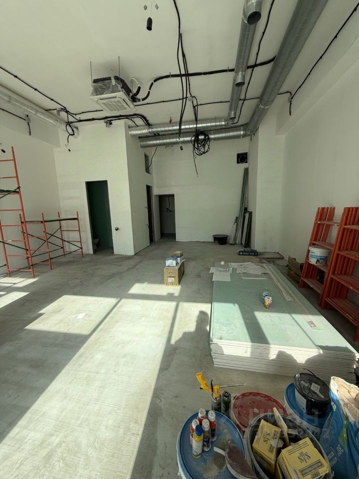 В помещении выполнена предчистовая отделка, а именно: шумоизоляция потолка и стен, обшивка гкл в два слоя, выведены сантехнические коммуникации, на полу мокрая стяжка, частично разведена электрика.