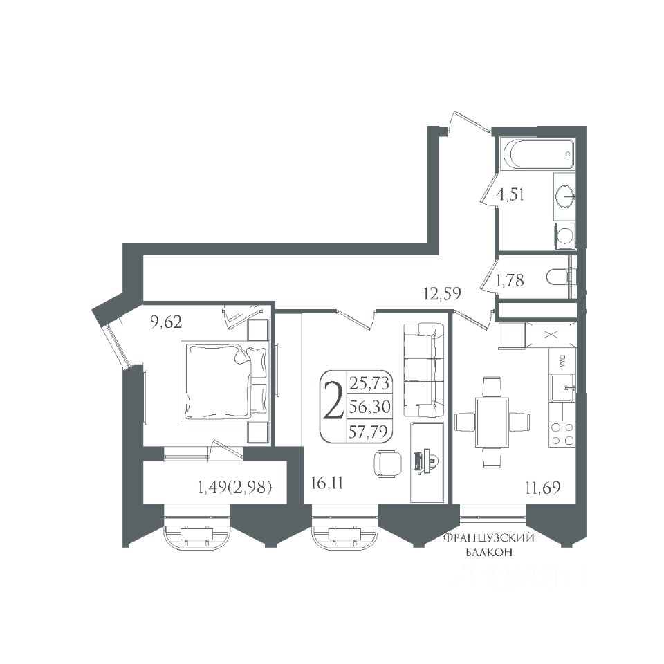 Общая площадь57,79 м²