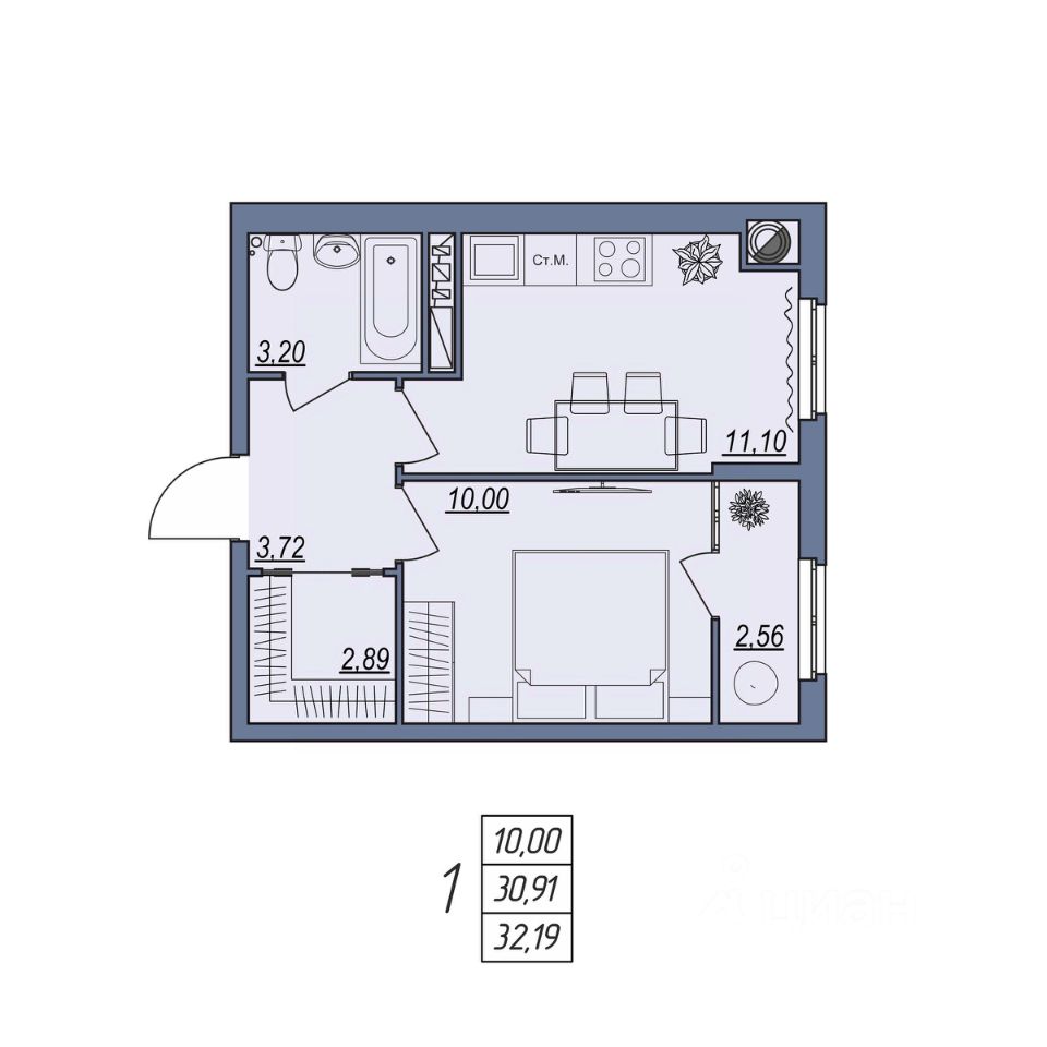 Общая площадь32,19 м²