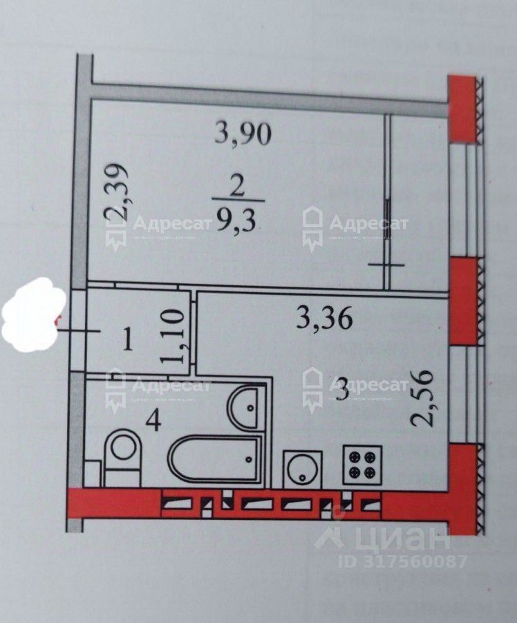 Общая площадь составляет 21 кв. м, из которых жилая занимает 9,3 кв. м, а кухня — 7,2 кв. м.
