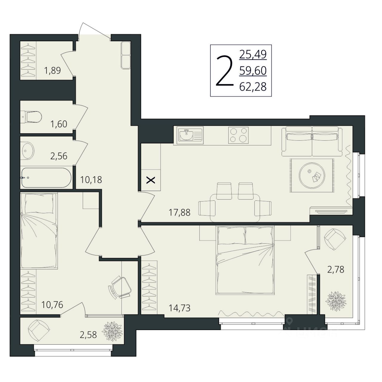 Общая площадь62,28 м²