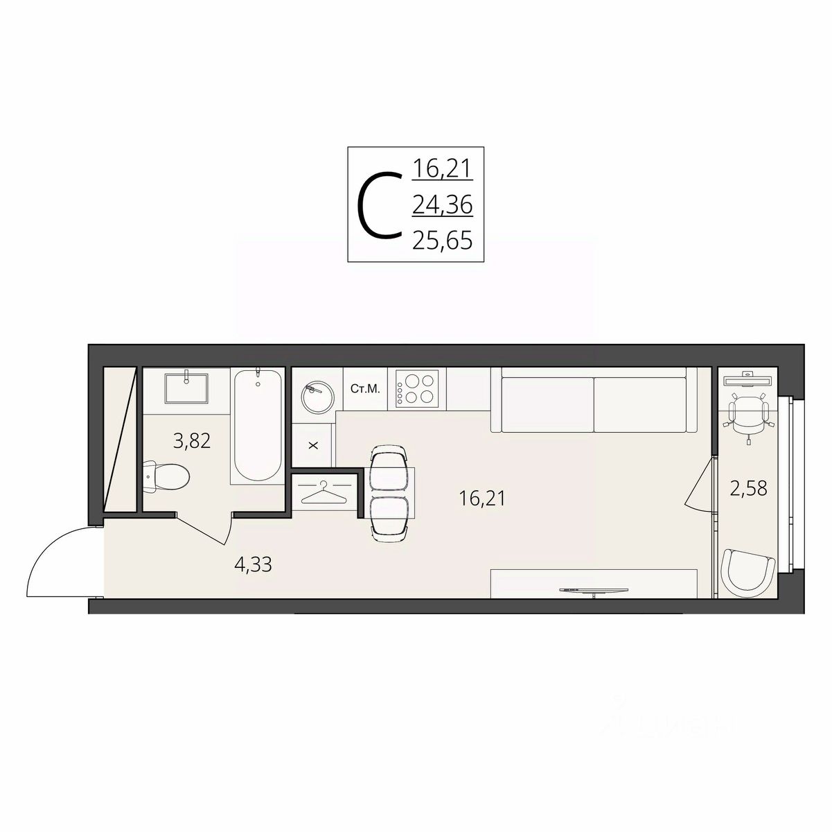Общая площадь25,65 м²