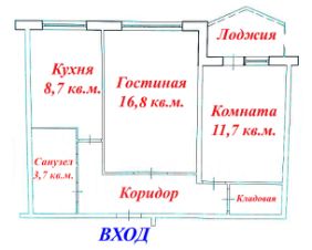 Квартира улучшенной планировки: общая площадь - 50,8 кв.м. + лоджия, жилая площадь - 28,5 (16,8 + 11,7) кв.м., площадь кухни - 8,7 кв.м.