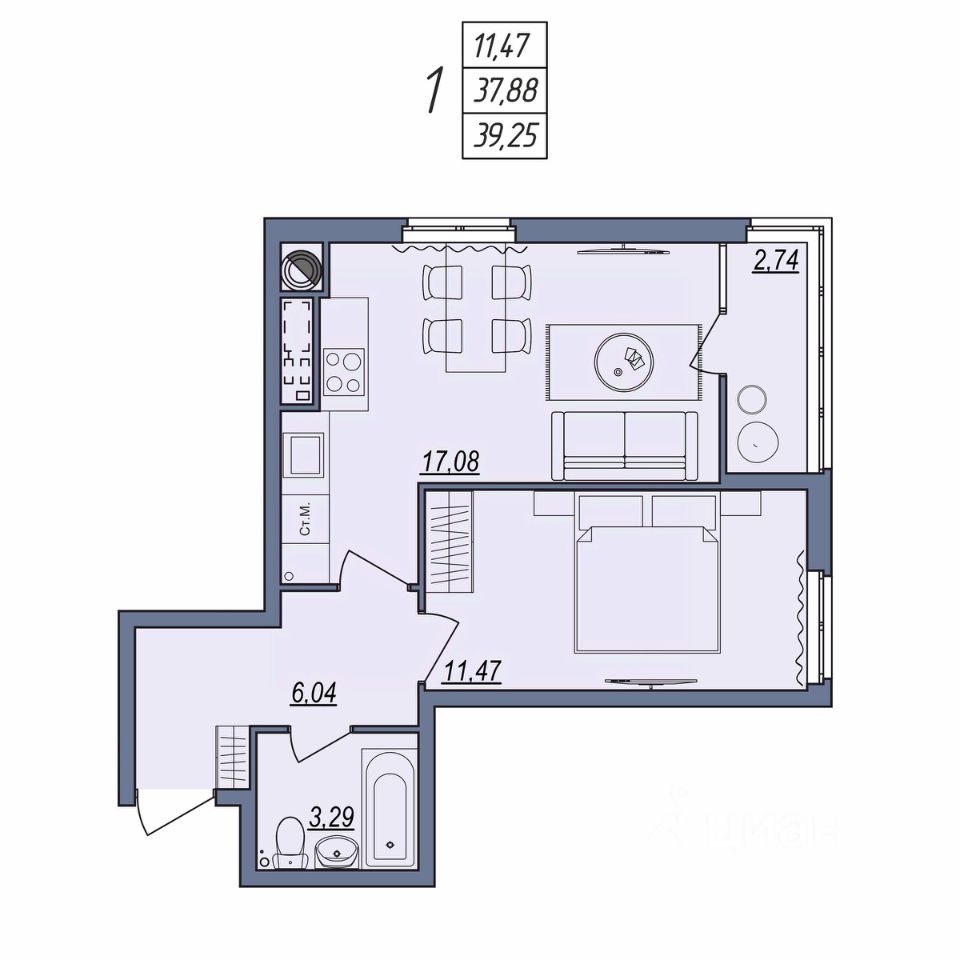 Общая площадь39,25 м²