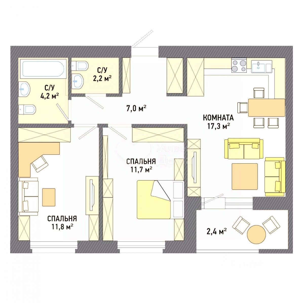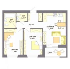 Раздельные комнаты: 11.8 + 11.7 метров