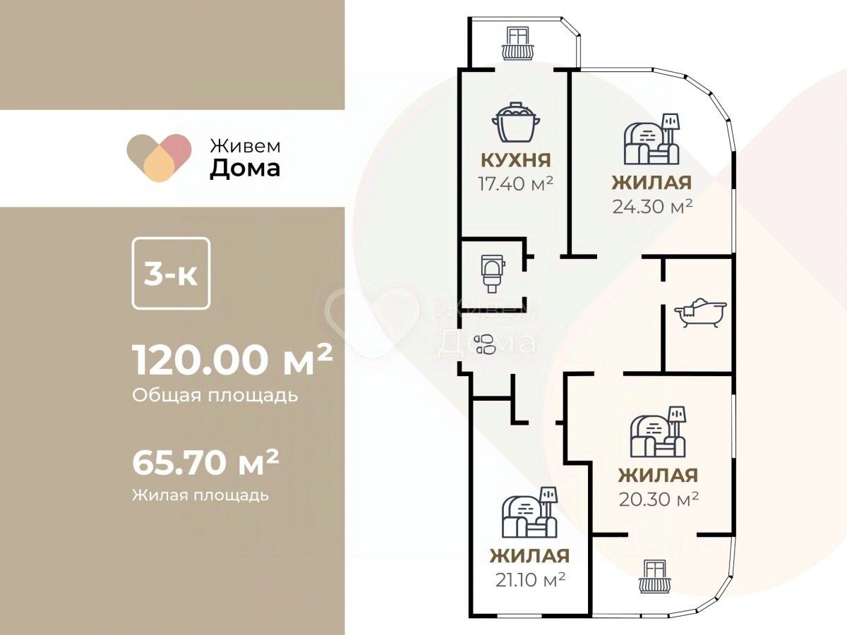 Раздельные комнаты: 21.1 + 24.3 + 20.3 метров