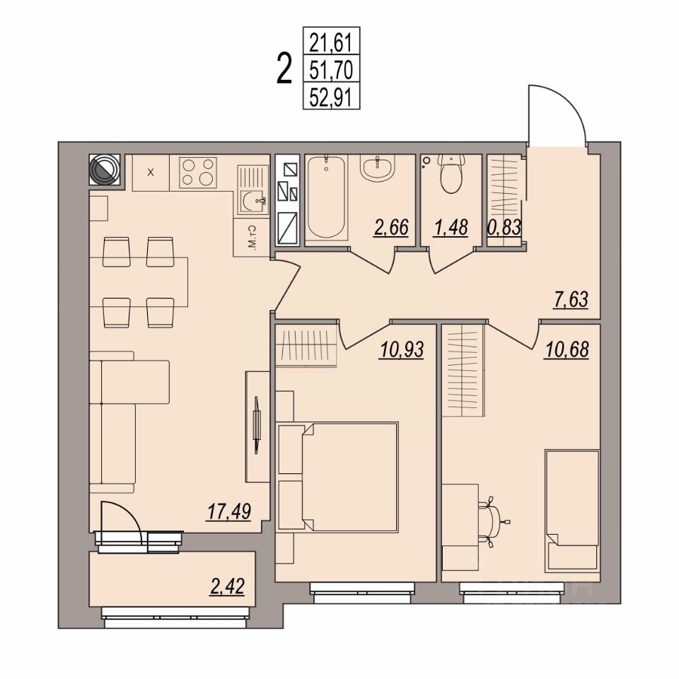 Продается 2-комн. квартира, 52,91 м²