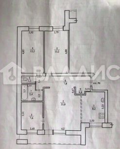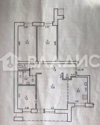 Общая площадь квартиры составляет 74,5 квадратных метров, из которых 54 квадратных метра — жилая площадь, комнаты 12,2+13,2+21+7,6 квадратных метров, кухня — 8,2 квадратных метра.