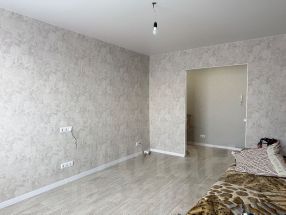 Стены выровнены штукатуркой, наклеены обои на флизелиновой основе.