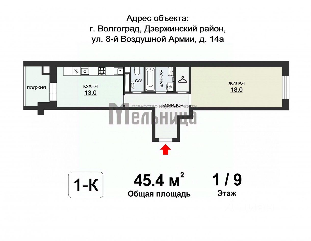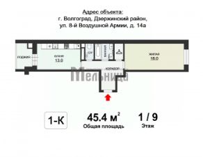 Общая площадь квартиры (без учета балкона) - 45.4 кв.м.: