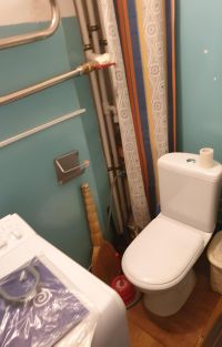 В квартире заменены водопроводные трубы,установлены счетчики, всё функционирует,что позволяет сразу въехать и жить.Коммунальные платежи небольшие.Окна выходят во двор, что обеспечивает тишину и уединение. Санузел совмещённый и полностью оборудован.