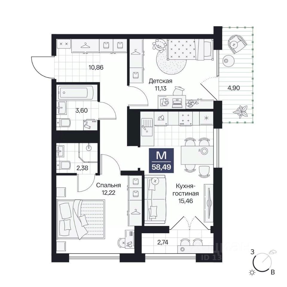 Общая площадь58,49 м²