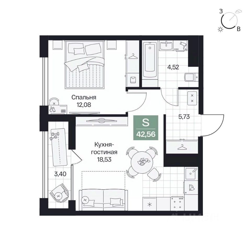 Общая площадь42,56 м²