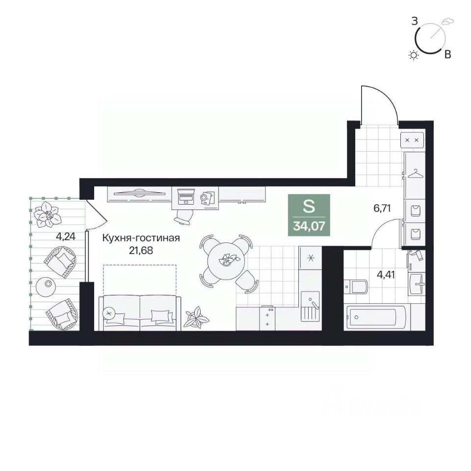 Общая площадь34,07 м²