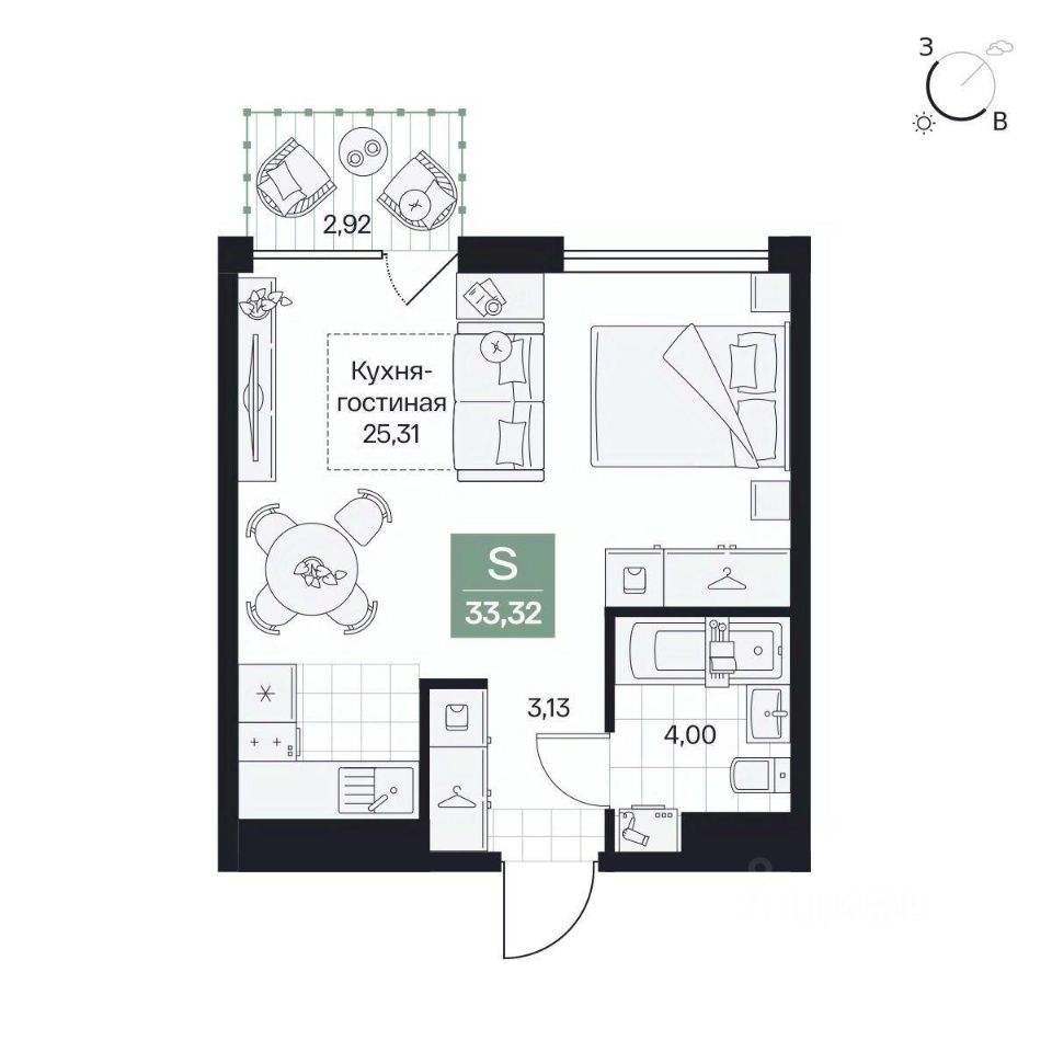 Общая площадь33,32 м²