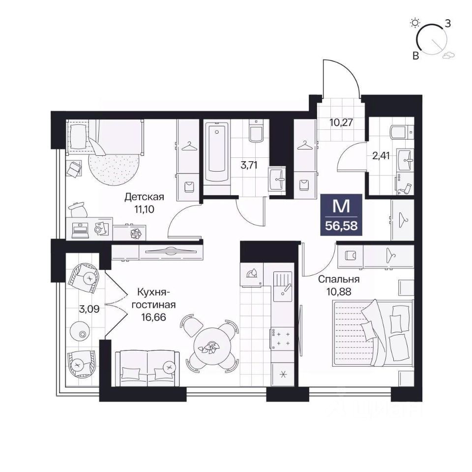 Общая площадь56,58 м²