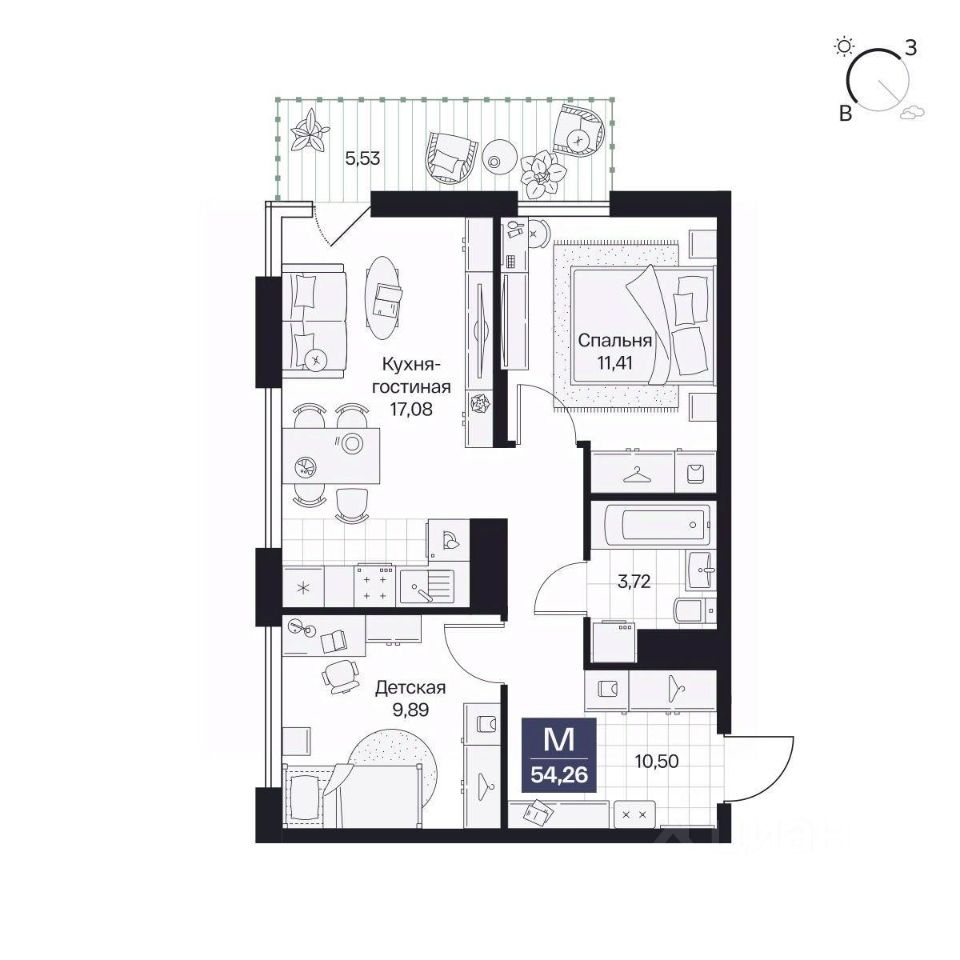 Общая площадь54,26 м²