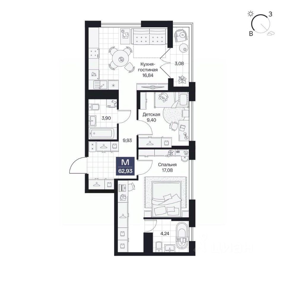 Общая площадь62,93 м²