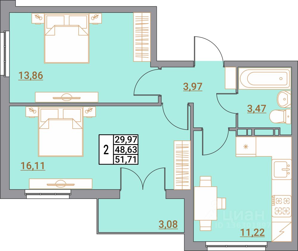 Общая площадь51,71 м²