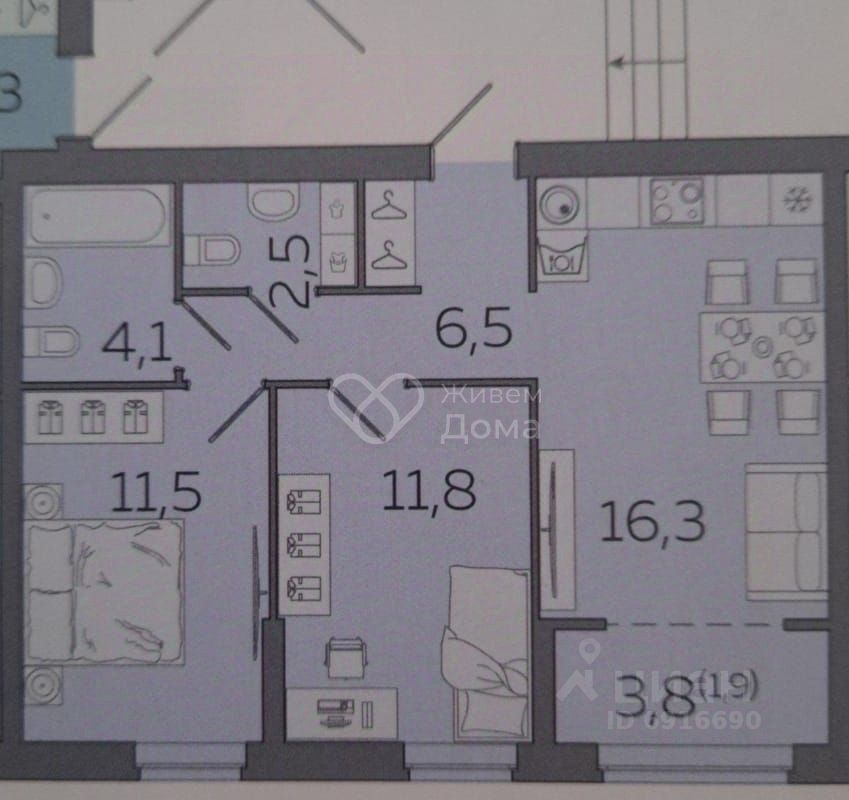 Планировка: общая 52.90 / жилая 23.30 / кухня 16.30 кв. метров.