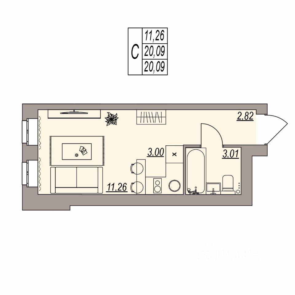 Общая площадь20,09 м²