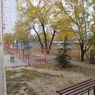 Во дворе детская площадка, большая парковочная зона вокруг дома.