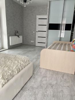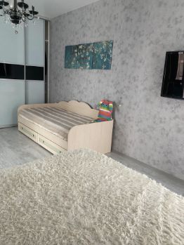 В комнате встроенный шкаф, кровать из эко-кожи со встроенным механизмом и местом для хранения, тумбочка прикроватная, детская кровать с ортопедическим матрасом, в прихожей встроенная, очень вместительная гардеробная.